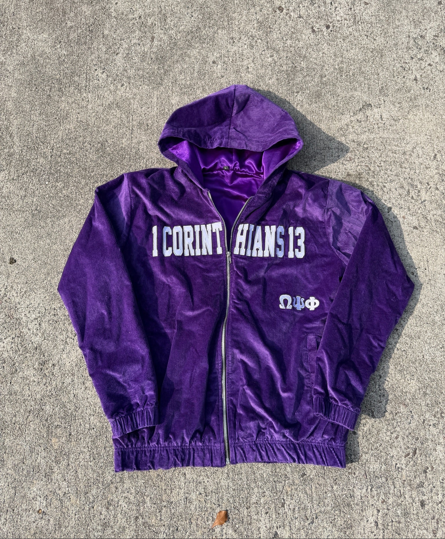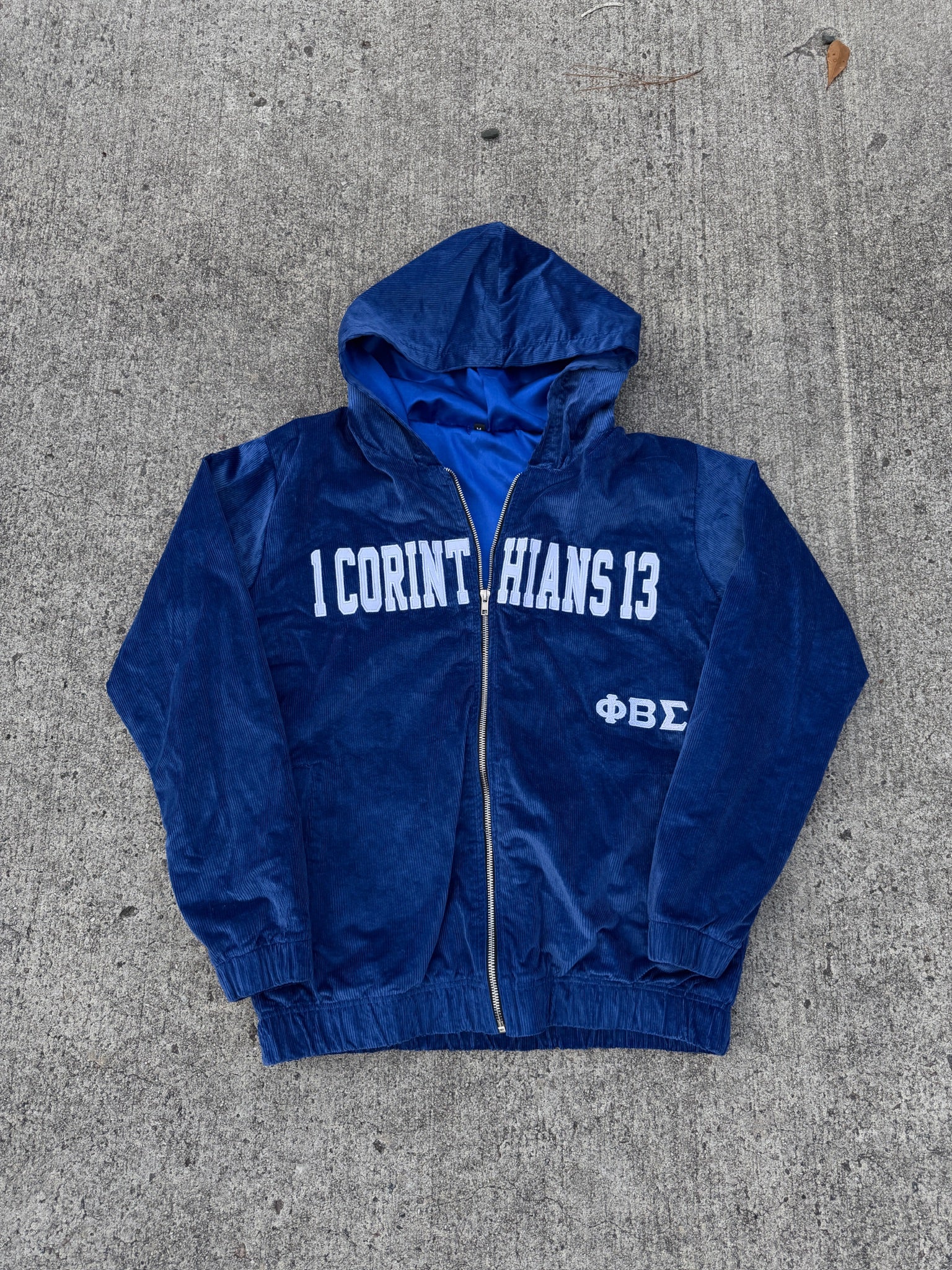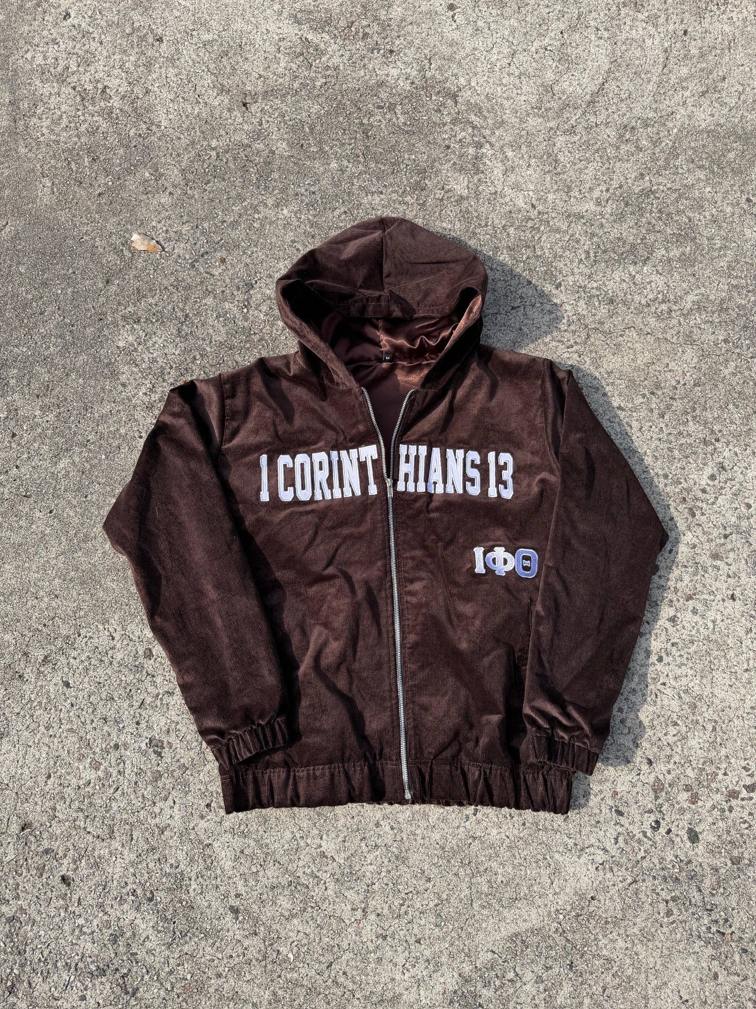 (PRE ORDER) Crafted for members of the Divine 9, this corduroy zip-up honors faith. The structured corduroy exterior is complemented by a premium oil-treated lining that ensures durability and comfort through repeated wear. The embroidered 1 Corinthians 13 passage celebrates the scriptural foundation of love that underpins Greek life and brotherhood. This piece functions as a meaningful symbol of your organization's values while maintaining the polished aesthetic expected of Greek wear. Perfect for chapter events, casual gatherings, or everyday layering.