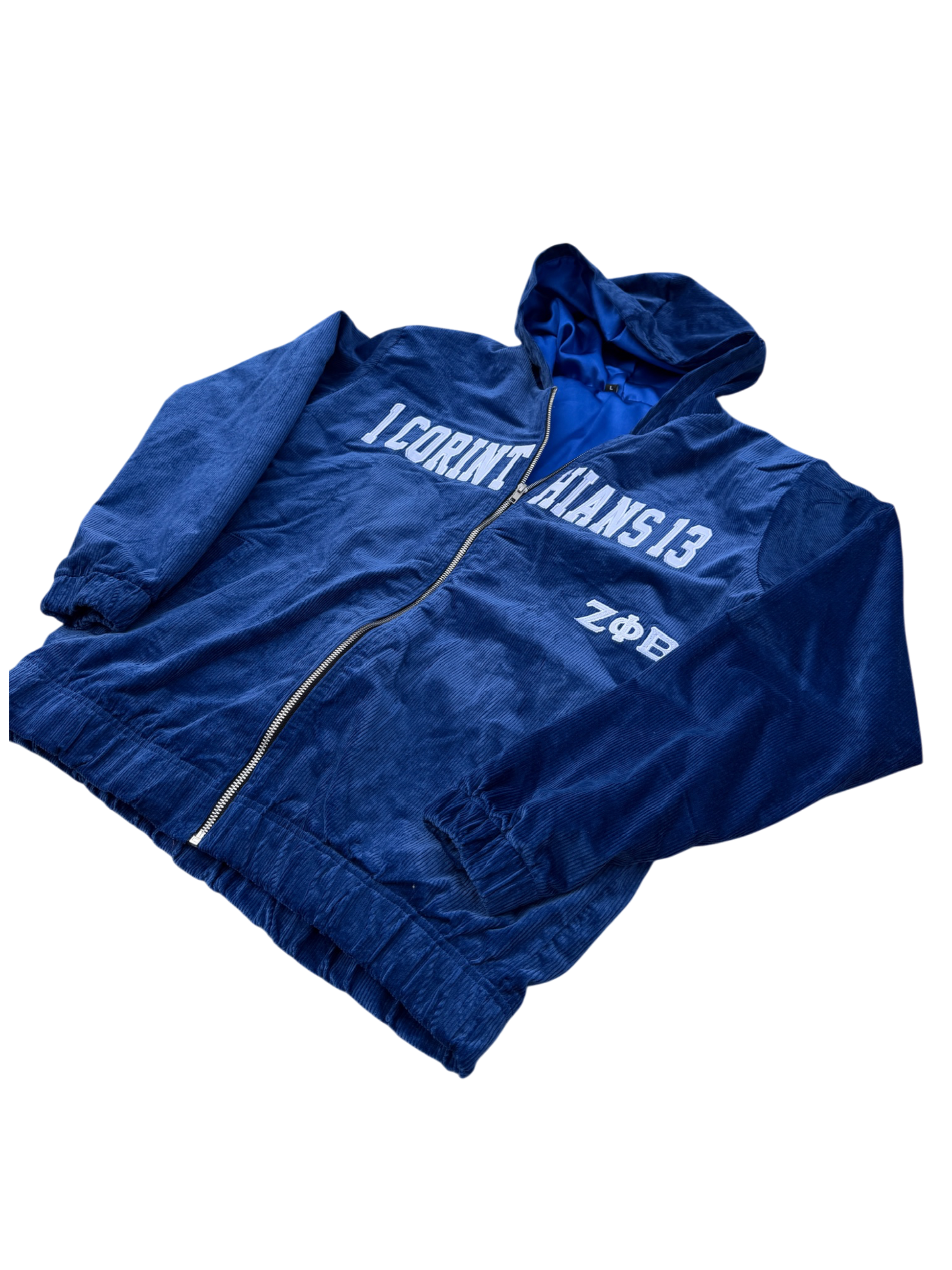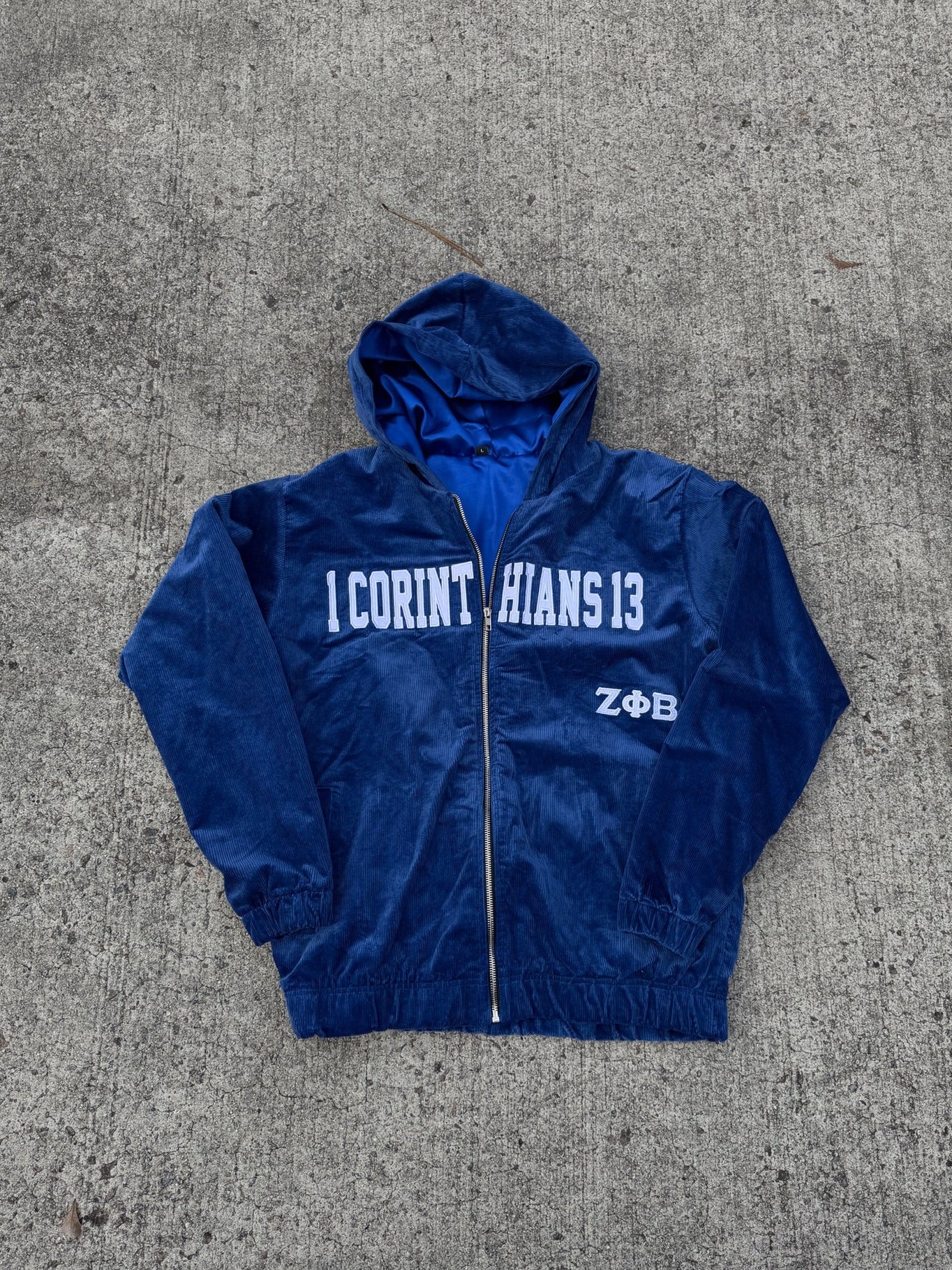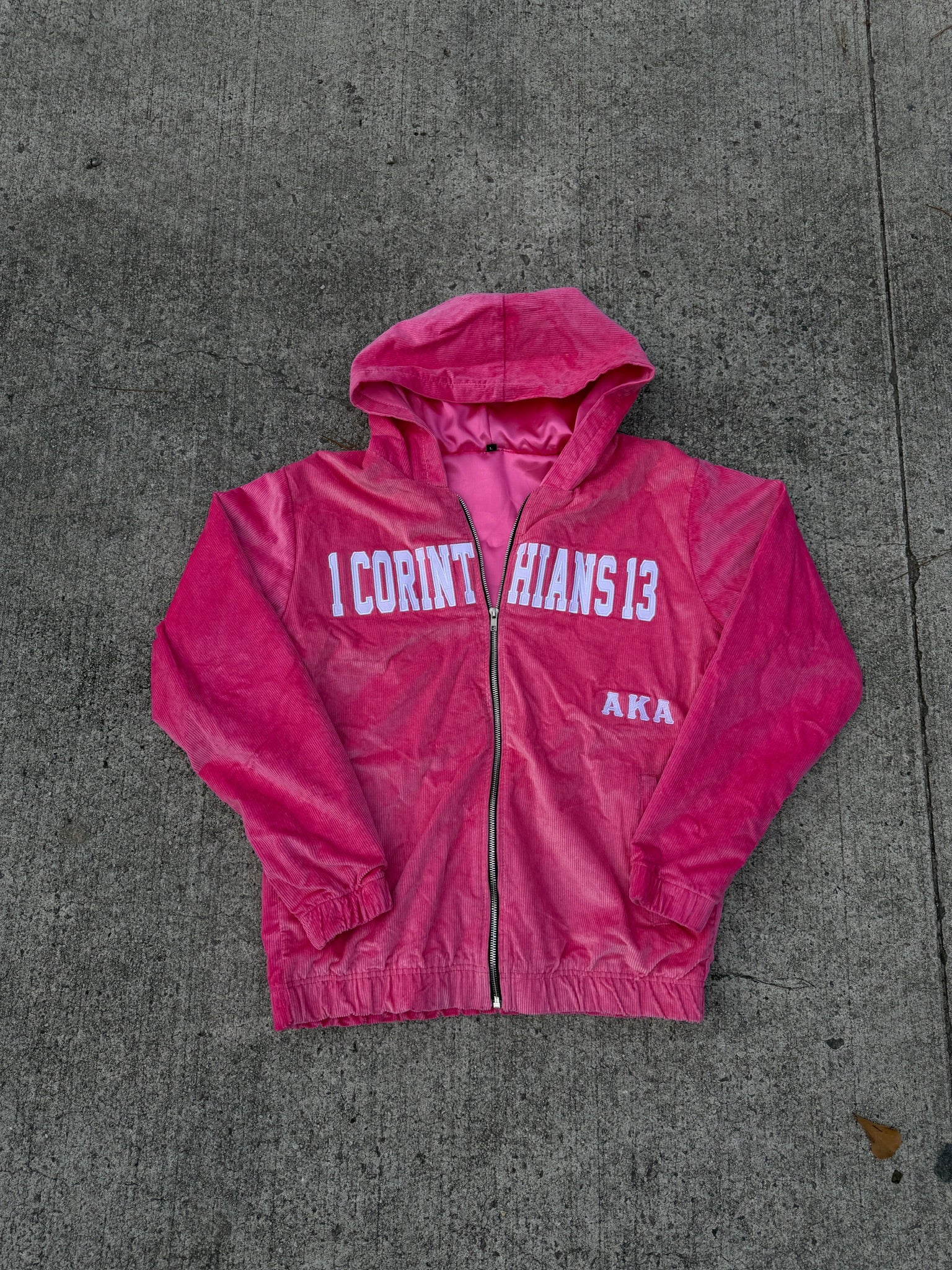 (PRE ORDER) Crafted for members of the Divine 9, this corduroy zip-up honors faith. The structured corduroy exterior is complemented by a premium oil-treated lining that ensures durability and comfort through repeated wear. The embroidered 1 Corinthians 13 passage celebrates the scriptural foundation of love that underpins Greek life and brotherhood. This piece functions as a meaningful symbol of your organization's values while maintaining the polished aesthetic expected of Greek wear. Perfect for chapter events, casual gatherings, or everyday layering.